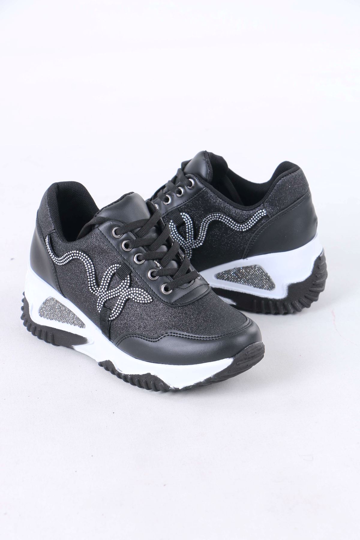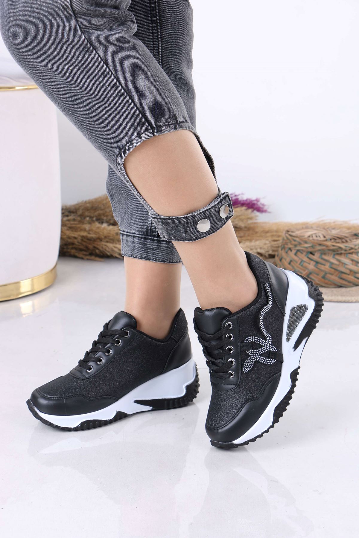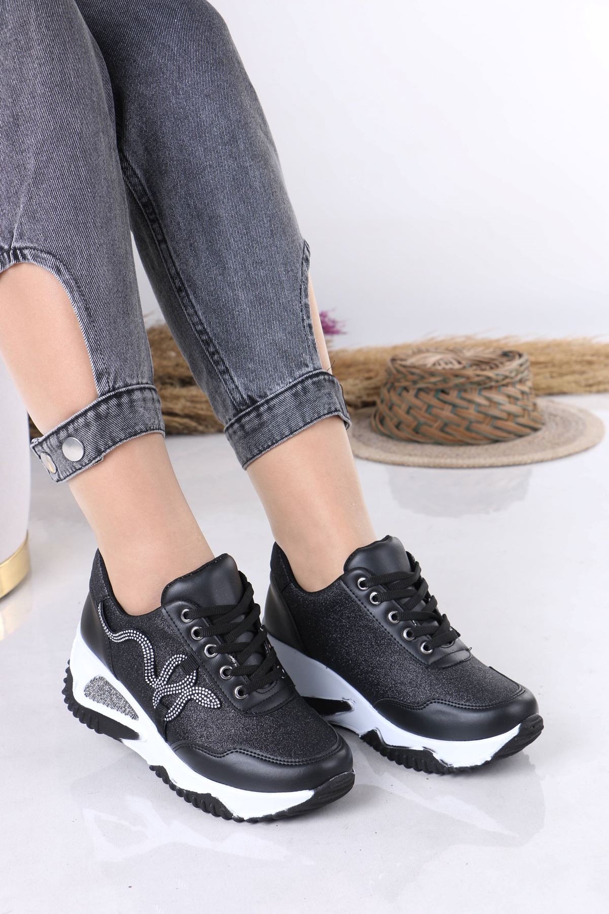 Aleza Siyah Beyaz Taban Mat Deri Taşlı Kadın Spor Ayakkabı