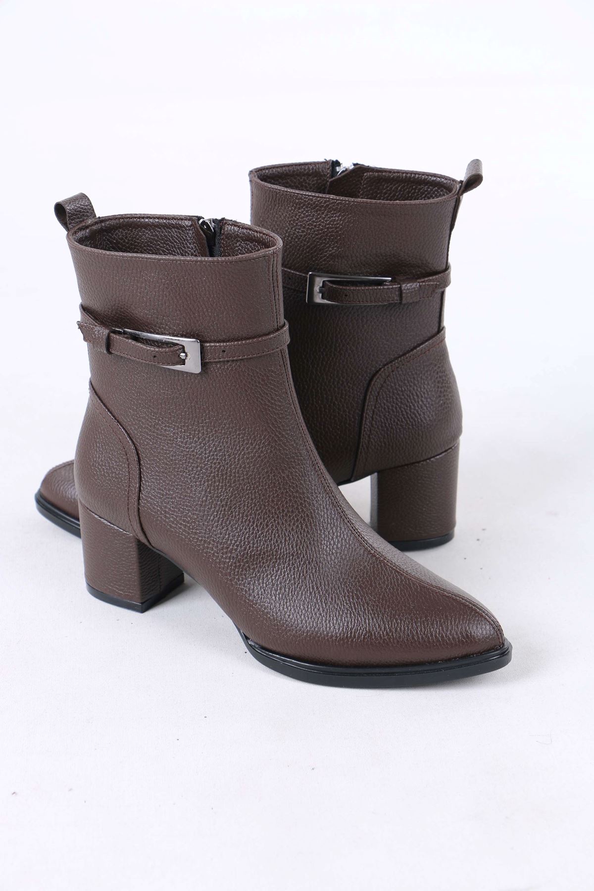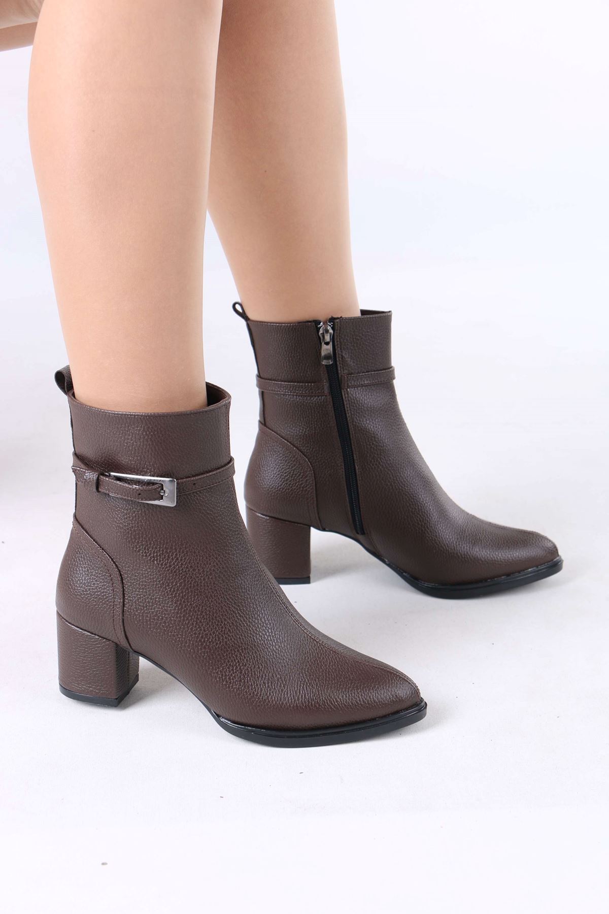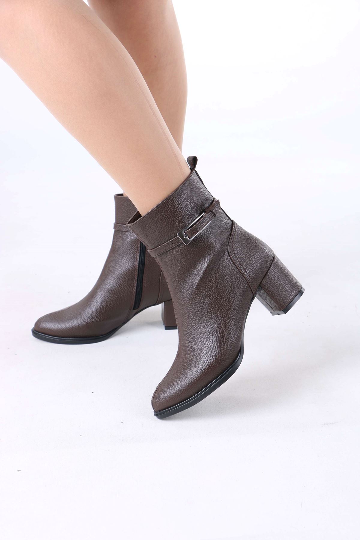 Junious Kahverengi Mat Deri Tokalı Fermuarlı Kadın Bot