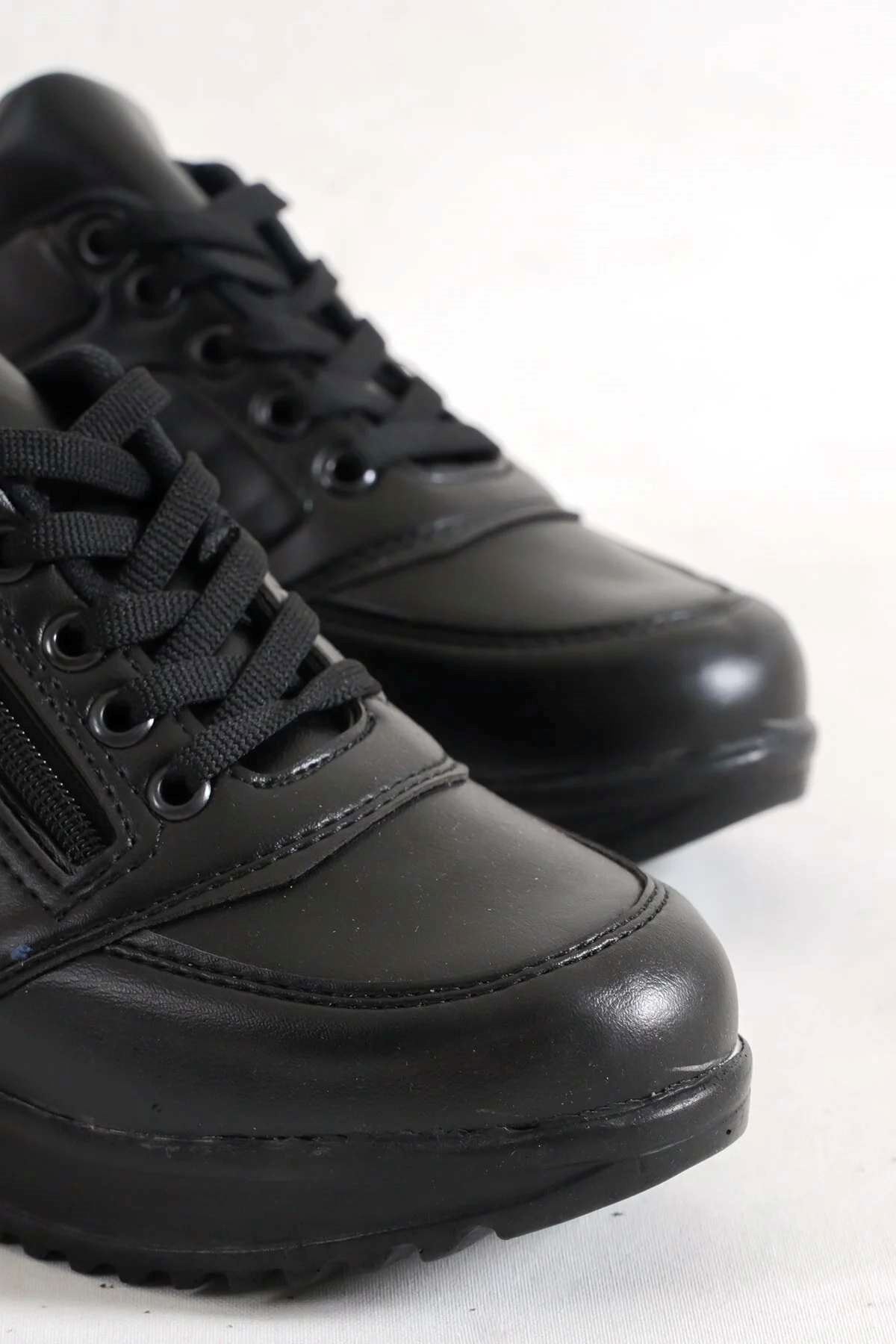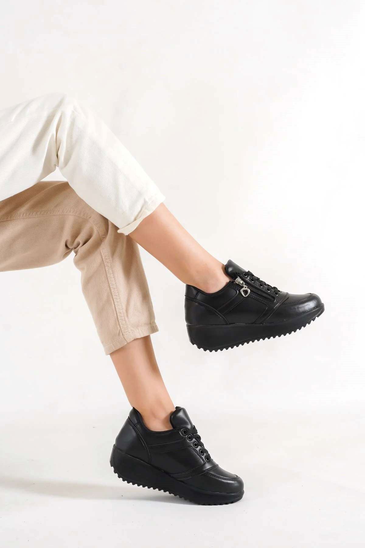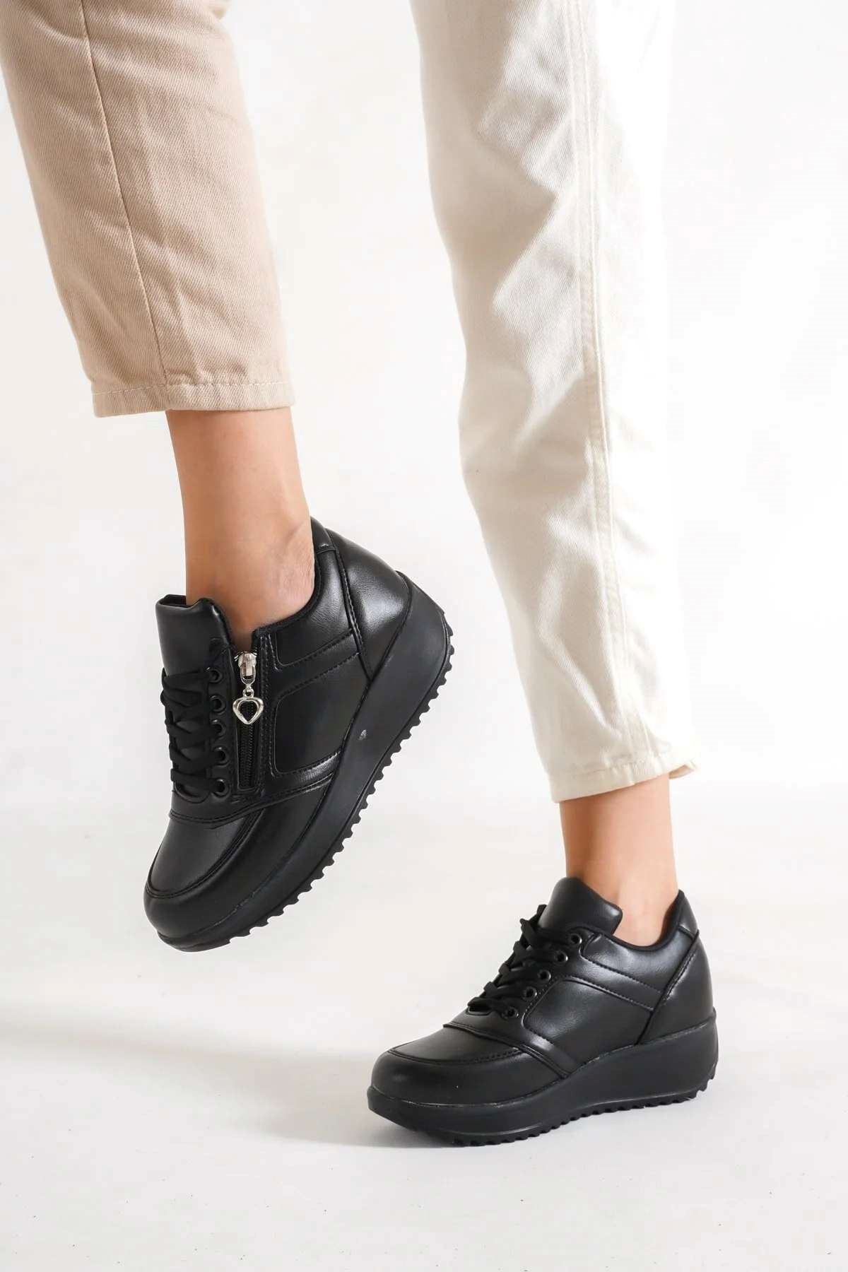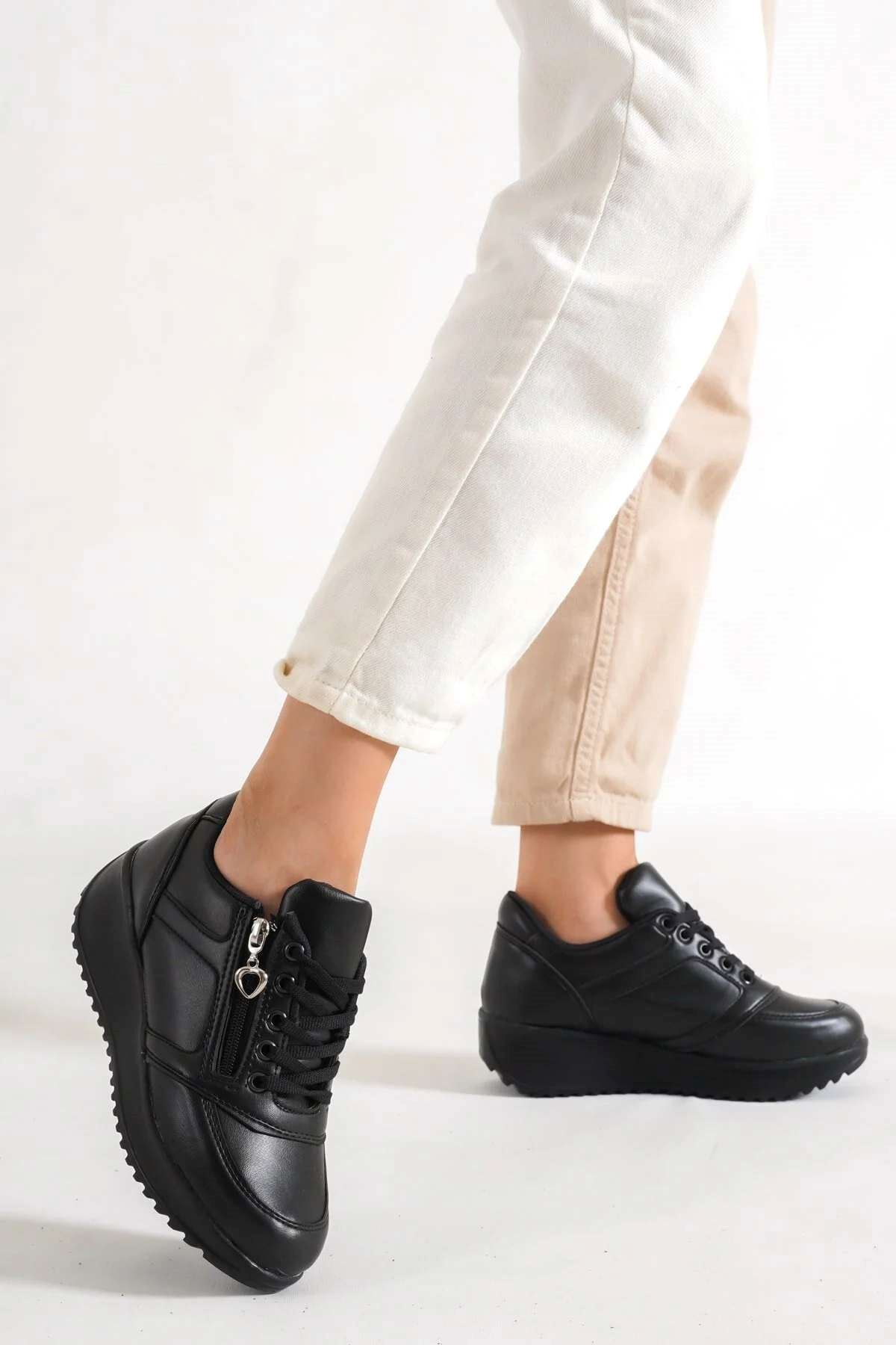 Karlens Siyah Mat Deri Fermuarlı Bağcıklı Kadın Spor Ayakkabı