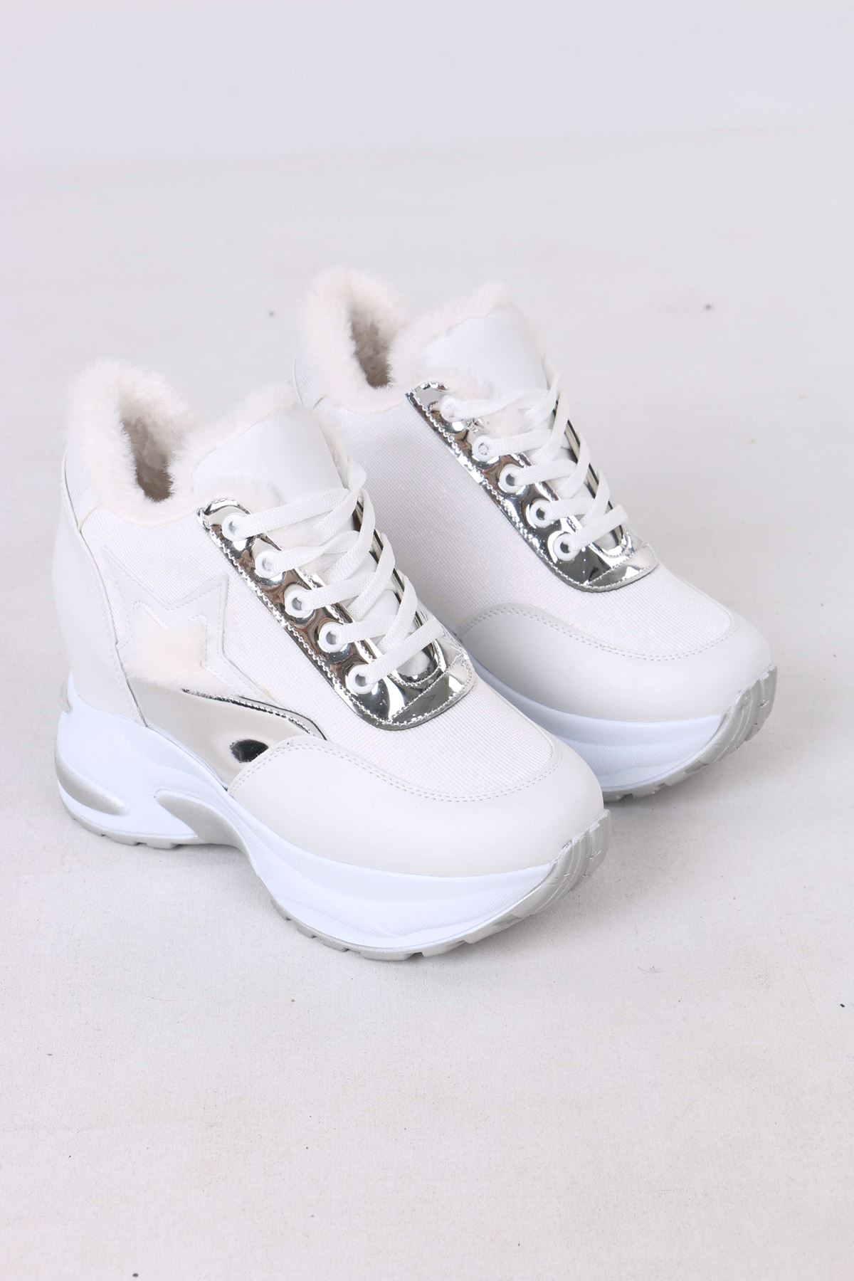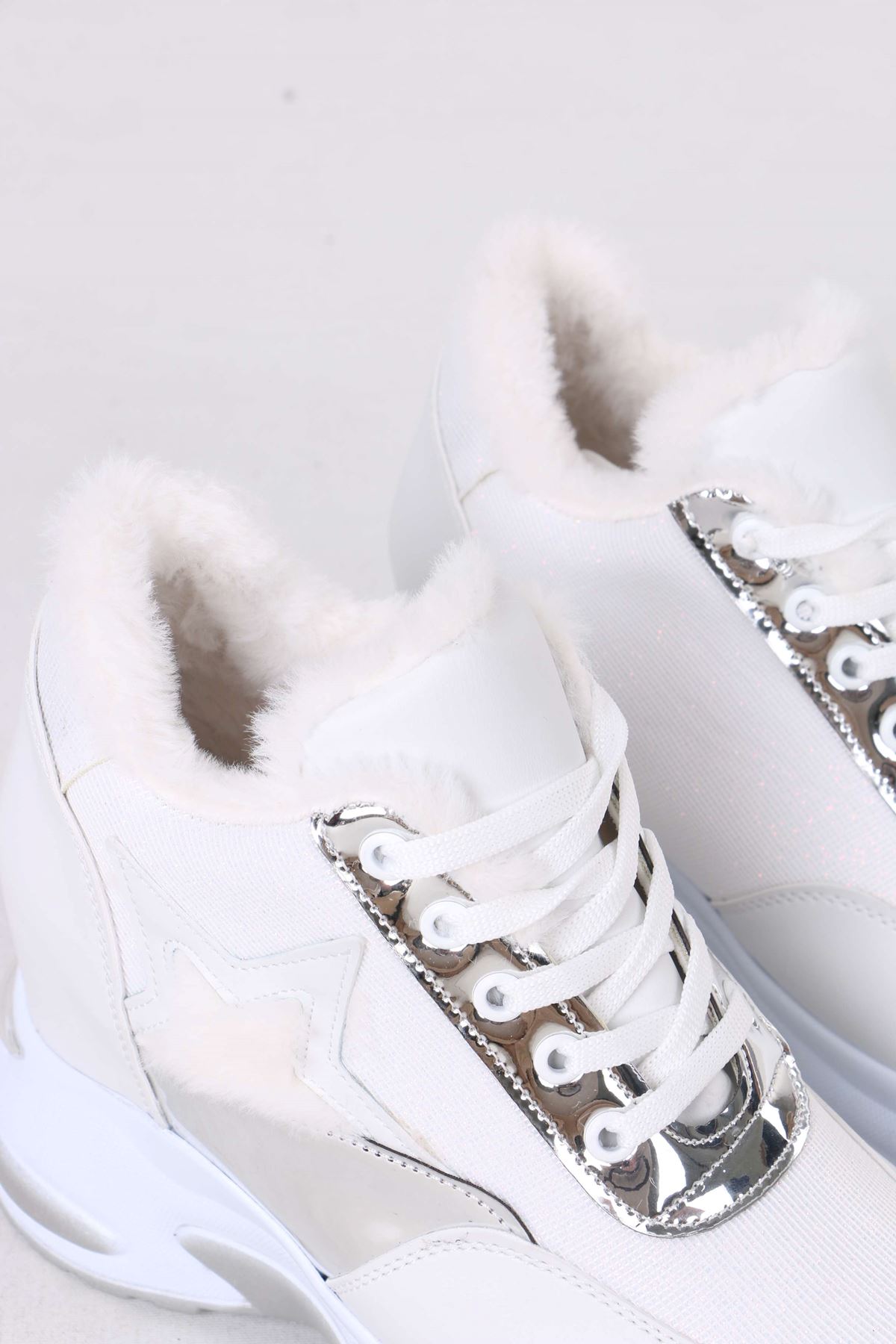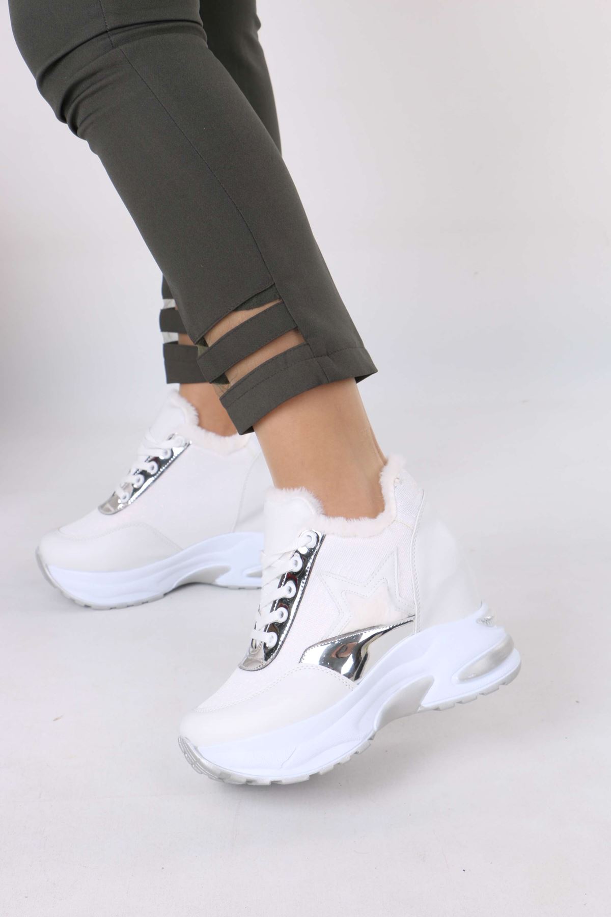 Katle Beyaz Kürklü Gizli Topuklu Kadın Spor Ayakkabı